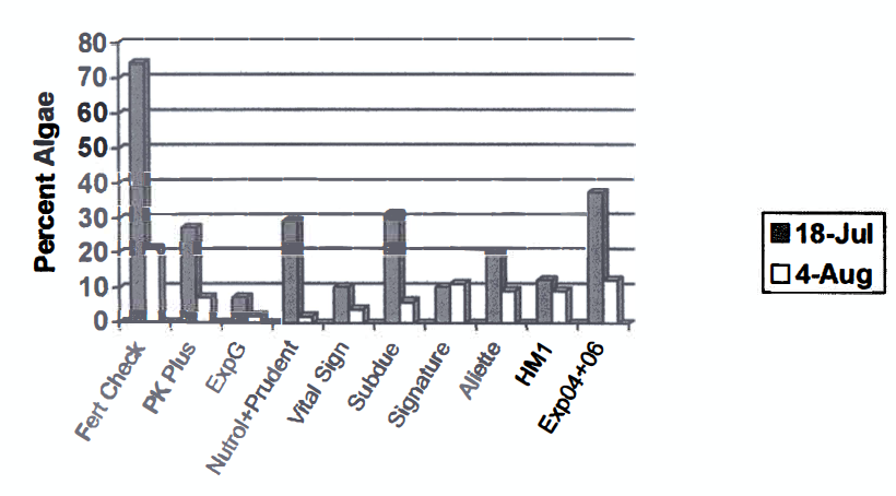 > On the creeping bentgrass putting green sites in Blacksburg, VA most of the treatments also provided good algae suppression. Do the phosphite applications perturb P-metabolism of algae as well as oomycetes such as pythium?